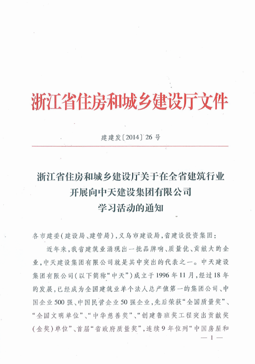 《浙江省住房和城乡建设厅关于在全省建筑行业开展向KU酷游官网建设集团有限公司学习活动的通知》